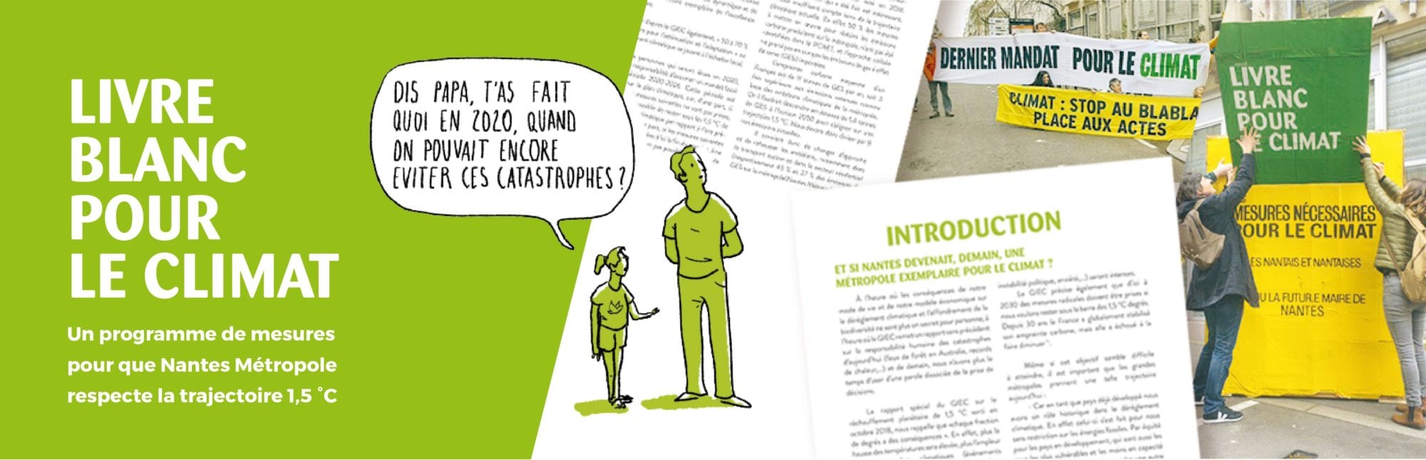 En janvier 2020, avec 19 associations nantaises*, nous avons publié le Livre blanc pour le climat. Ce document regroupe l’ensemble des mesures qu’il est nécessaire de mettre en place au cours des 10 prochaines années si nous voulons respecter les objectifs fixés par les accords de Paris.