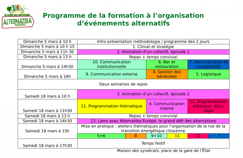 Alternatiba Nantes propose un cycle de formation à l’organisation d’événements alternatifs, réparti sur deux jours : le dimanche 5 et le samedi 18 mars, de 9h30 à 18h30, à la Maison des syndicats, place de la gare de l’État, sur l’île de Nantes.