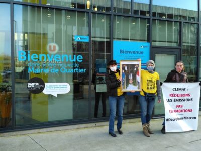 - Actions contre l’inaction politique en matière écologique et sociale : décrochages de portrait de Macron (le premier ici, puis quatre autres là et encore un là), avec sortie d’un portrait lors de l’Assemblée des assemblées des Gilets jaunes et remise d’un portrait à l’auteur de BD Cyril Pedrosa, qui ont entraîné des gardes à vue et perquisitions, et un procès à Nantes en septembre 2020 !