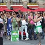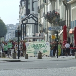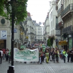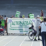 De la grue jaune au coeur du quartier du Bouffay, la manifestation joyeuse et revendicative s’est terminée en beauté dans les rues du Bouffay, qui accueilleront dimanche 28/09 Alternatiba Nantes, le village des alternatives à la crise climatique et aux autres crises.